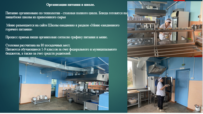 Школьная столовая расположена в здании школы, имеет в наличии набор помещений и оборудования, позволяющие осуществлять приготовление безопасной и сохраняющей пищевую ценность продукции и кулинарных изделий. Количество посадочных мест в обеденном зале позволяет обеспечить посадку учащихся согласно графику.