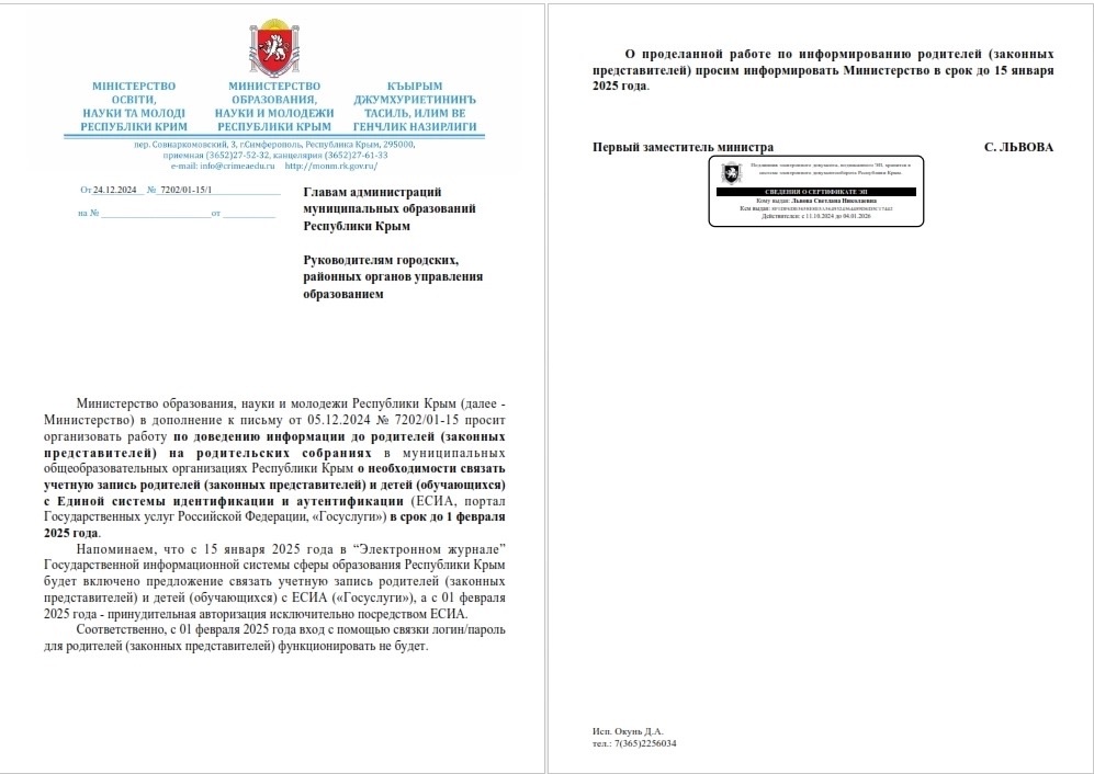 Министерство образования, науки и молодежи Республики Крым (далее - Министерство) в дополнение к письму от 05.12.2024 № 7202/01-15 уведомляет о необходимости связать учетную запись родителей (законных представителей) и детей (обучающихся) с Единой системы идентификации и аутентификации (ЕСИА, портал Государственных услуг Российской Федерации, «Госуслуги») в срок до 1 февраля 2025 года.