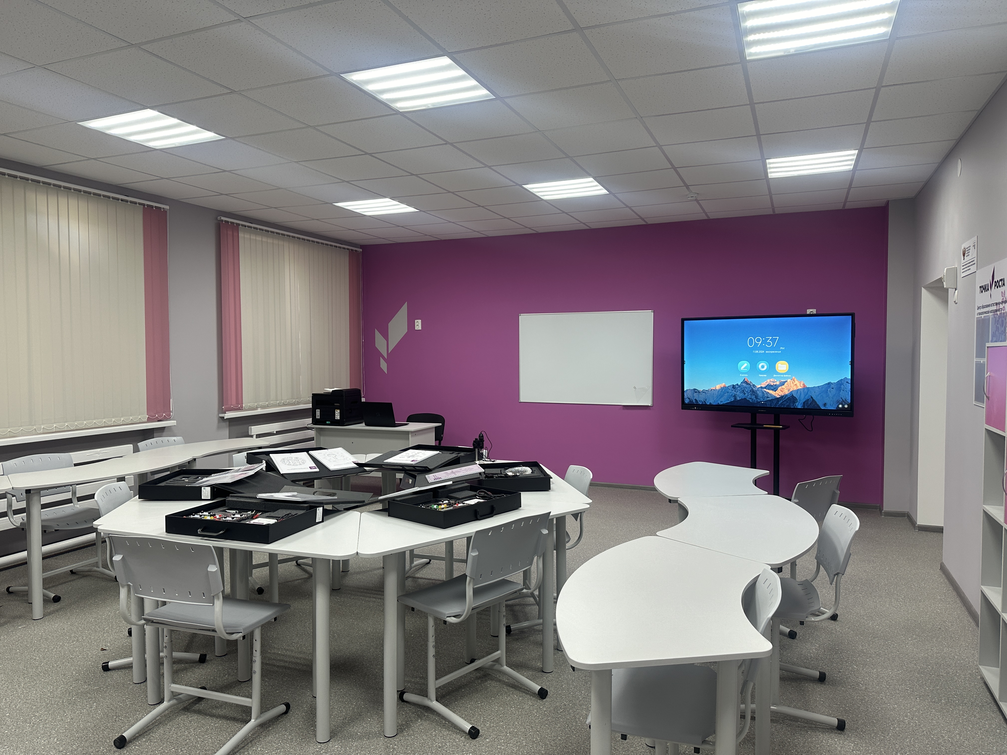 Очень приятно смотреть на дизайн классов, современно и со вкусом. Удивила интерактивная доска огромных размеров, необычные парты волнистой формы.